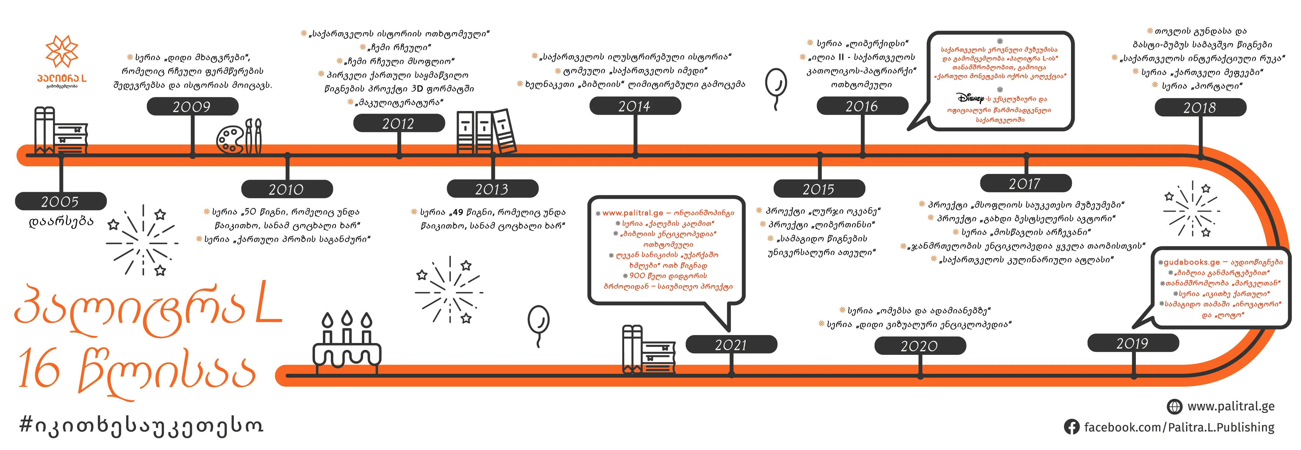 „გამომცემლობა პალიტრა L“ ბაზარზე ლიდერის პოზიციის დამკვიდრებისა და შენარჩუნების პარალელურად, მუდმივად იზრდება და ვითარდება. ამ ხნის განმავლობაში გამომცემლობამ მოიპოვა საიმედო პარტნიორის რეპუტაცია და სტაბილური საქმიანი ურთიერთობა დაამყარა ისეთ წამყვან გამომცემლობებთან თუ სააგენტოებთან, როგორებიცაა: Disney, Penguin Random House, Harper Collins, Curtis Brown, Bloomsbury, Oxford, Scolastic და სხვ. გამომცემლობის უმთავრესი ამოცანაა, მაქსიმალურად გაითვალისწინოს თანამედროვე მკითხველის ინტერესები და შესაძლებლობები. ამ პრინციპისადმი ერთგულებას ადასტურებს ჩვენი მასშტაბური პროექტები „გუდას აუდიოწიგნები“ და „მაკულიტერატურა“. ჩვენს მკითხველს უკვე შეუძლია ასობით კლასიკოსი თუ თანამედროვე ავტორის წიგნებს, უმაღლესი ხარისხის ჩანაწერით, მისთვის მოსახერხებულ დროსა და გარემოში მოუსმინოს, ძველი და გამოუსადეგარი წიგნებისა თუ ჟურნალ-გაზეთების ახალ წიგნებში გადაცვლით კი ჩვენ უკვე 150.000-ზე მეტი ხე გადავარჩინეთ.